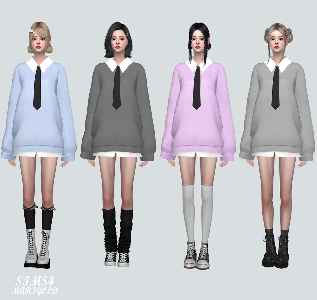 심즈4 스웨셔츠와 셔츠 넥타이가 붙어있는 미니 원피스입니다.