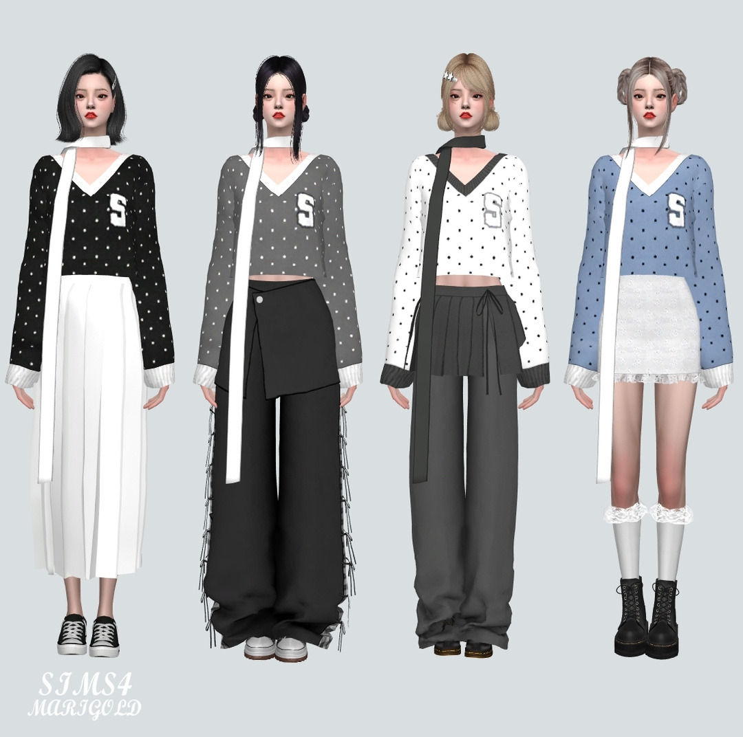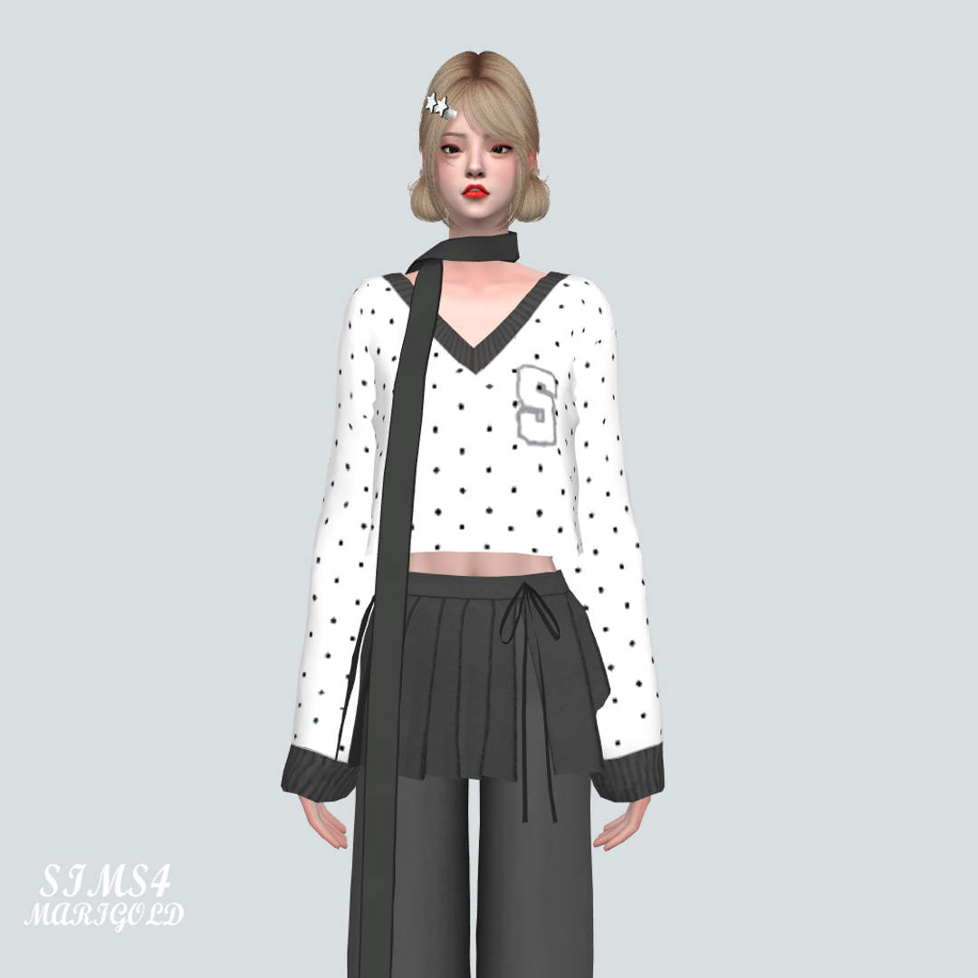 심즈4 브이넥 도트 크롭 스웨터와 스카프가 붙어있습니다.