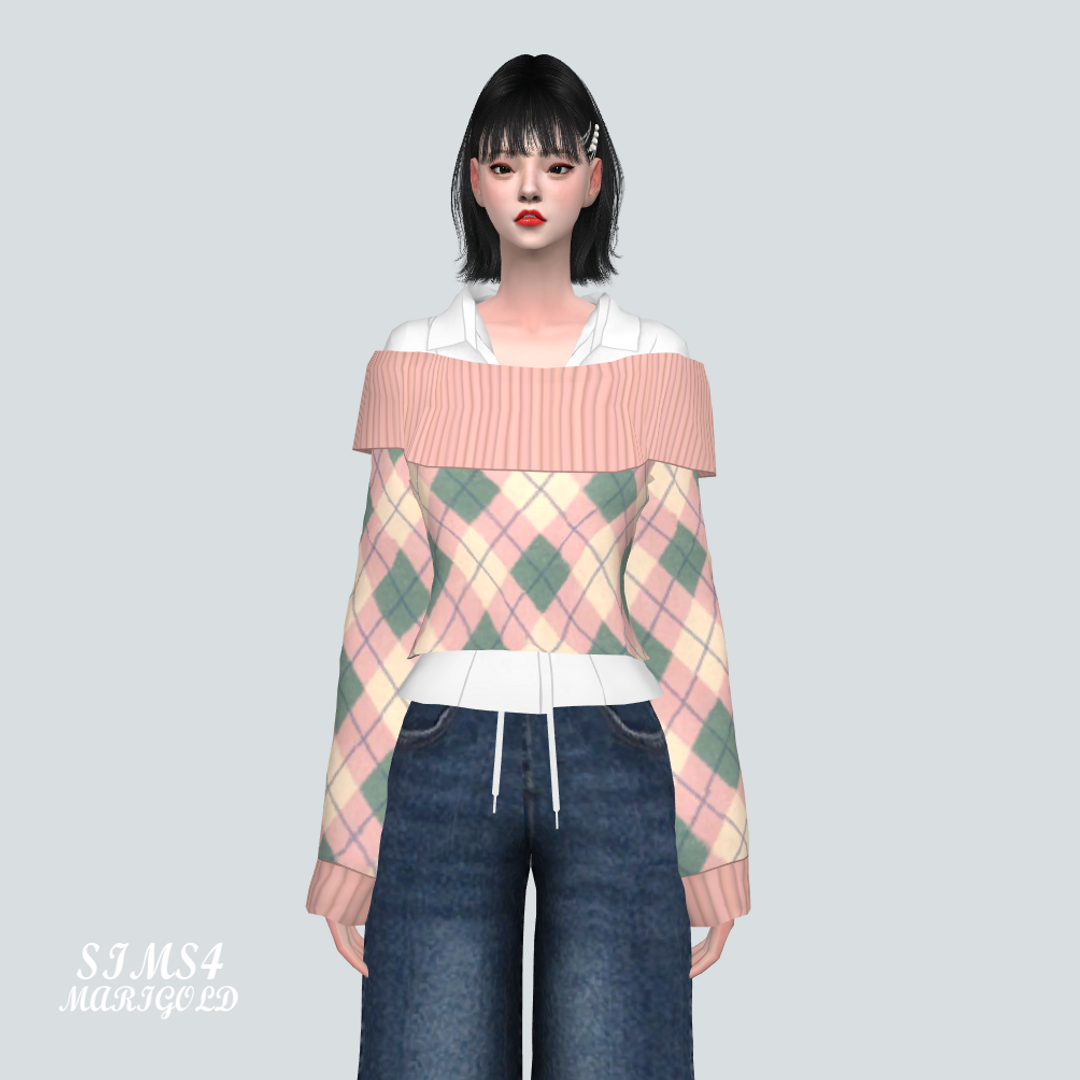 심즈4 체크무늬 오프숄더 크롭 스웨터와 셔츠가 붙어있습니다.