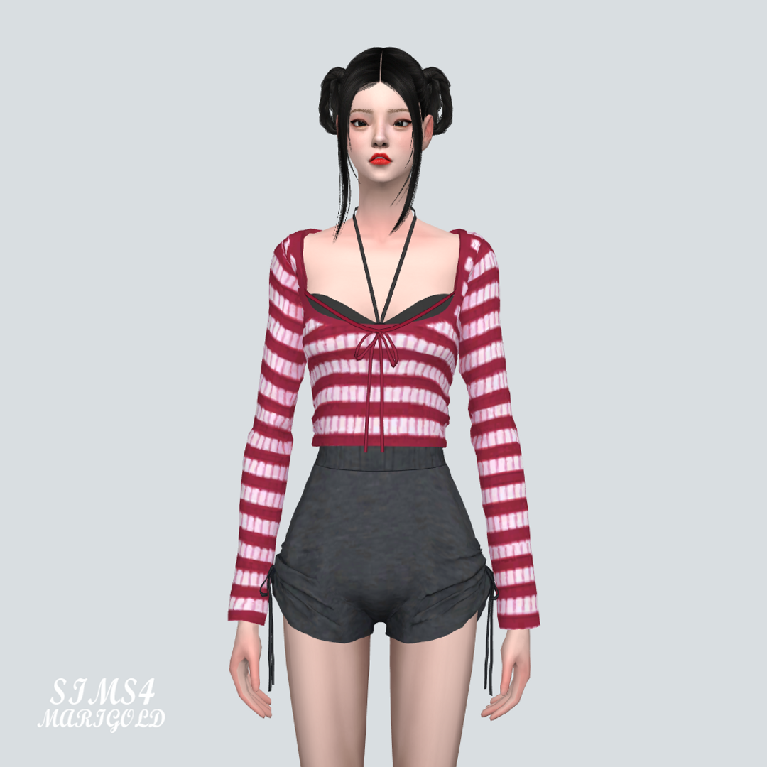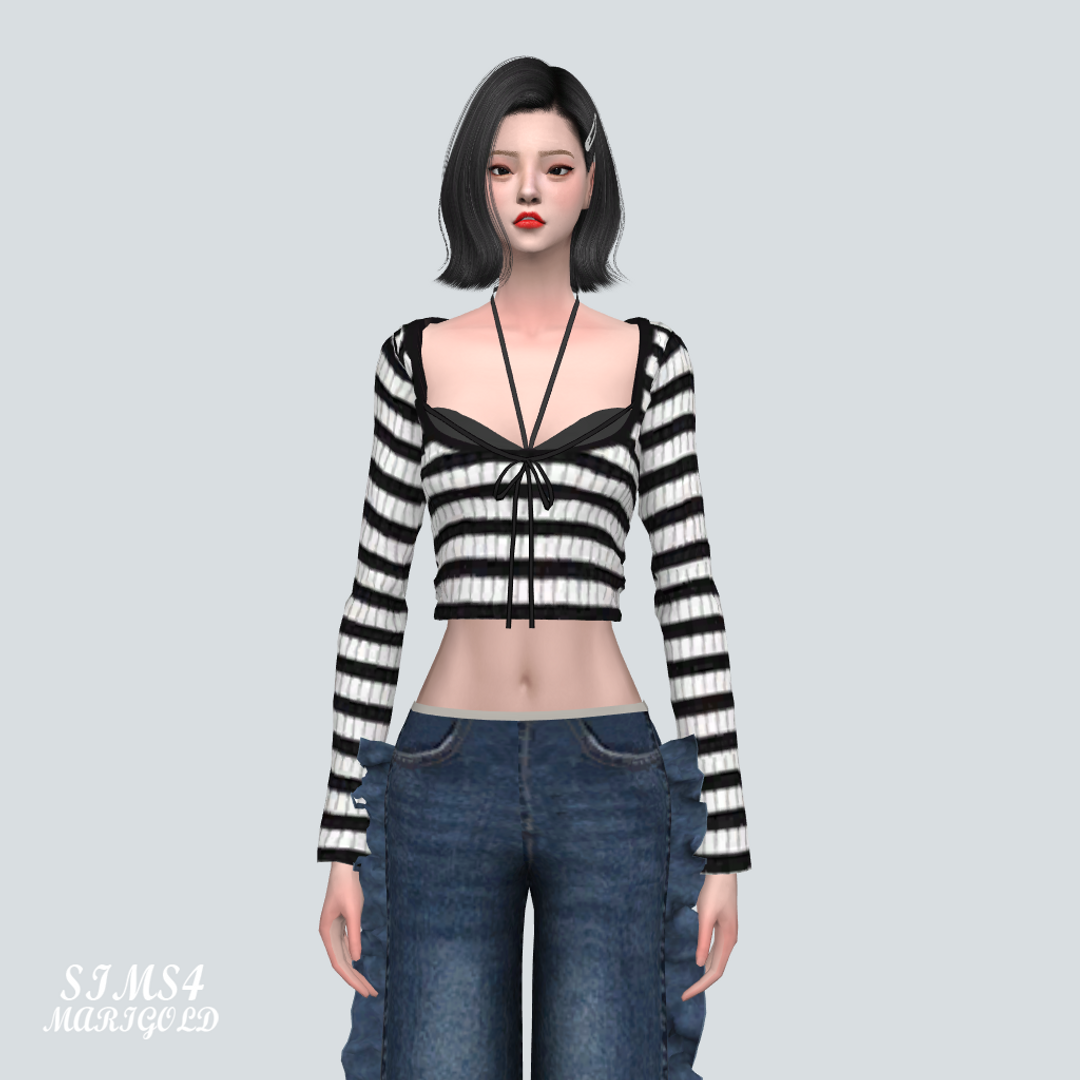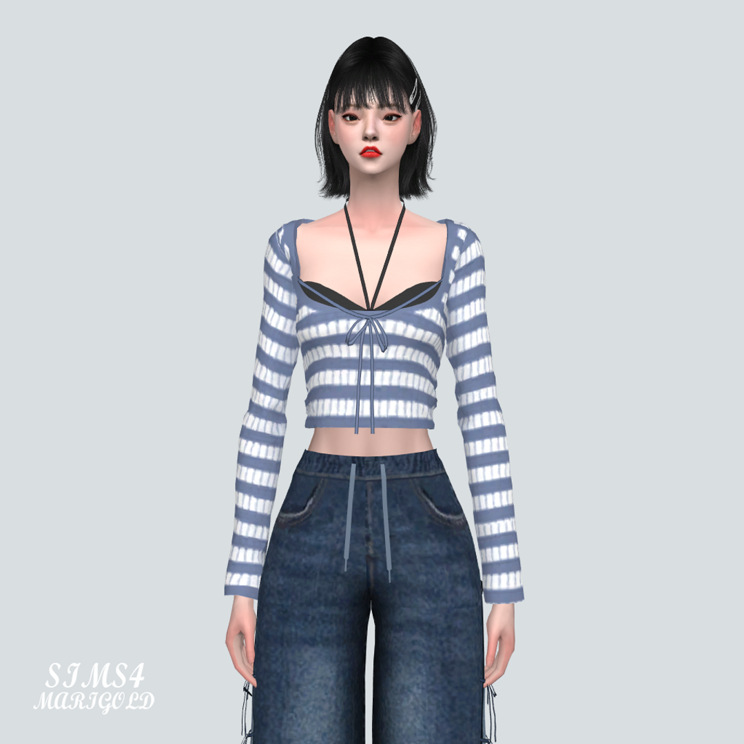 심즈4 줄무늬 리본 탑과 비키니 상의가 레이어드 되어있습니다.
