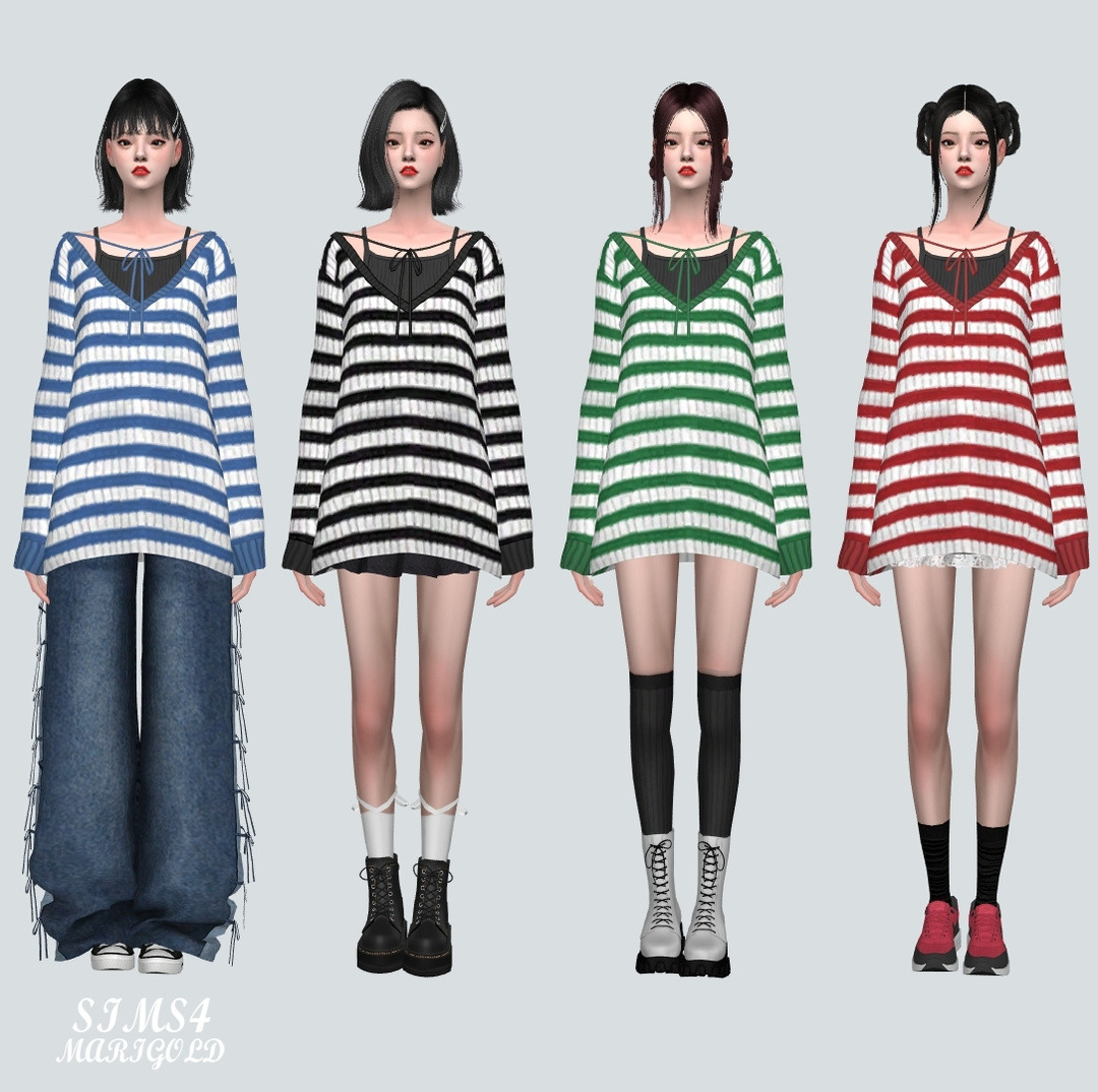 심즈4 리본 끈 장식이 달린 스트라이프 롱 스웨터입니다.